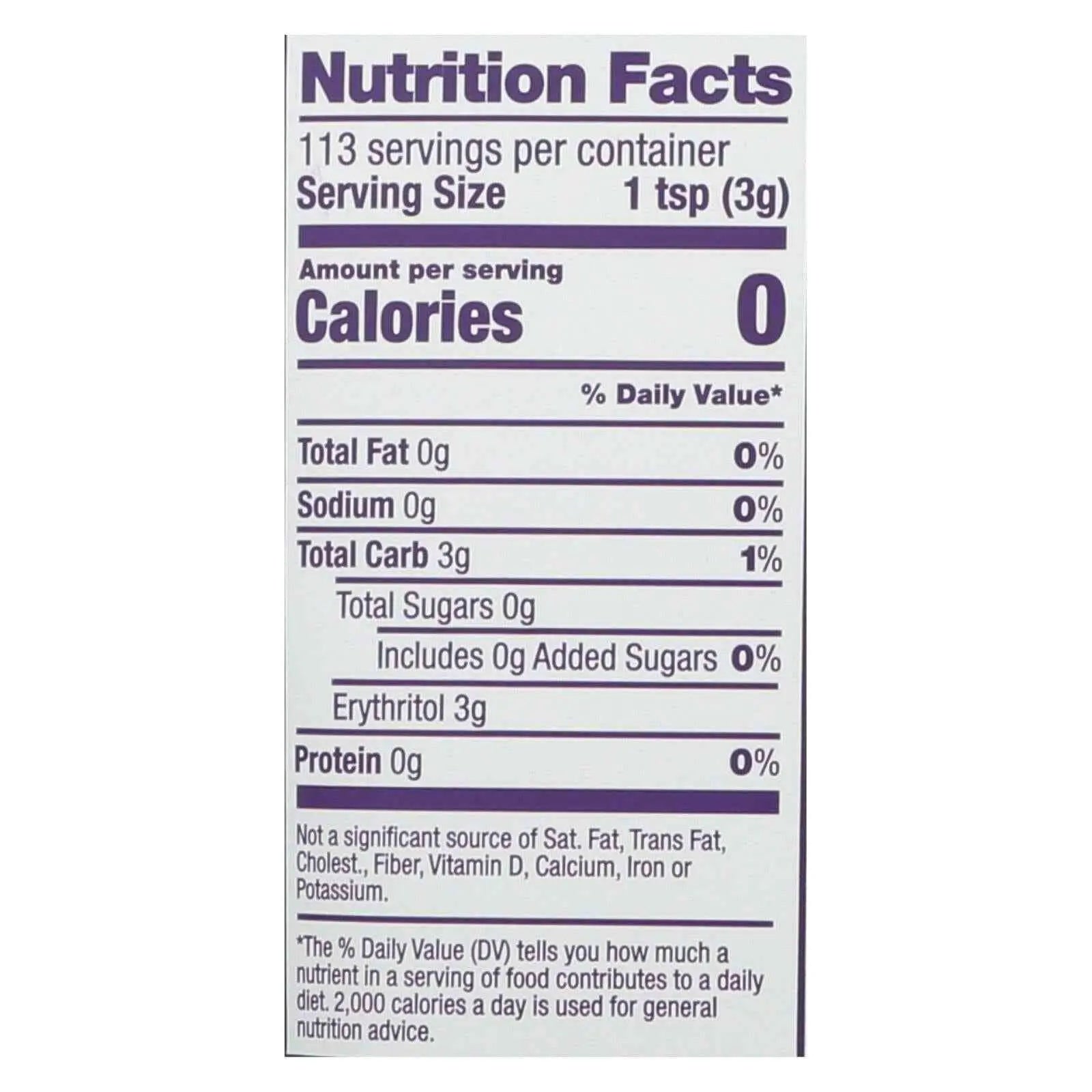 Swerve sugar replacement is a natural sweetener that's non-glycemic and has zero calories. With a serving size of 1 tsp. You'll get 113 servings to this 12 oz. Packet. This product is kosher and made without artificial flavors, ingredients or preservatives. Use is to sweeten beverages, desserts, recipes and more.