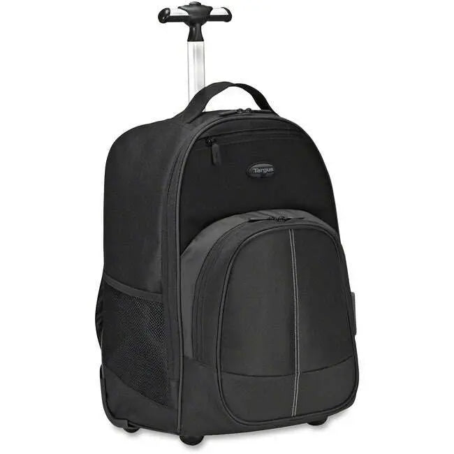 Rolling backpack features a comprehensive business work space with all of the compartments you need to carry files, business cards, keys, storage drives and more. Backpack fits a range of laptops with screens up to 16", including models with an extended battery. Quiet roller wheels and retractable handle offer easy transportation. Large-capacity, extended compartment space provides even more storing options. Integrated into the main compartment is a soft-lined interior pocket specifically for your media tablet, protecting it from bumps and scratches. In a separate section, there is a full workstation where you can store all your accessories, key fobs and pens. Pick up and go when rolling becomes inconvenient using the two shoulder straps that can be tucked away when not in use. The foldaway covers act as wheel covers when used as a backpack.