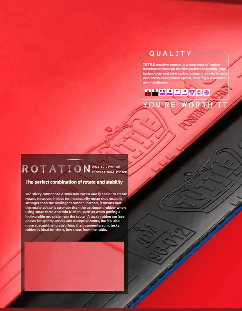 TUTTLE Positive Energy is a new type of adhesive developed through the combination of new and advanced technologies. It stands out through rotation and surpasses speed, making it irresistible for athletes to use