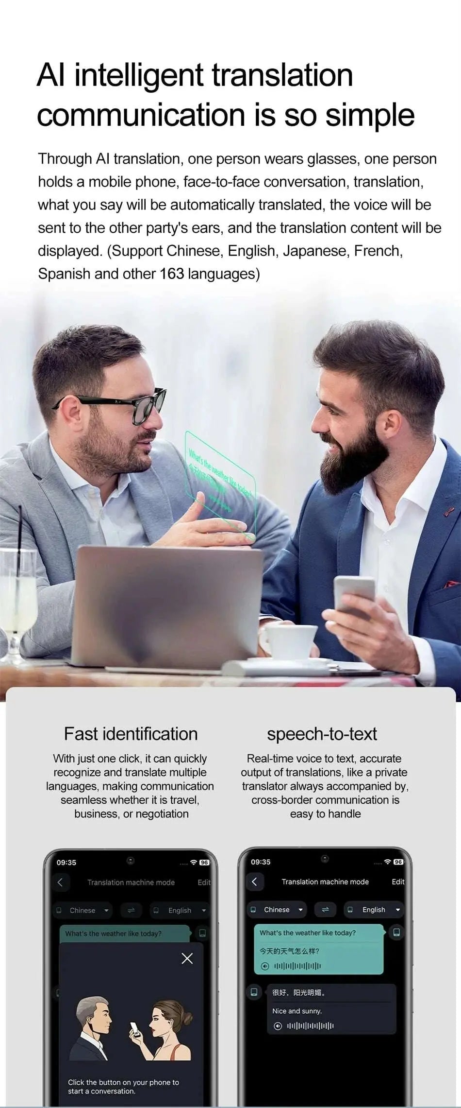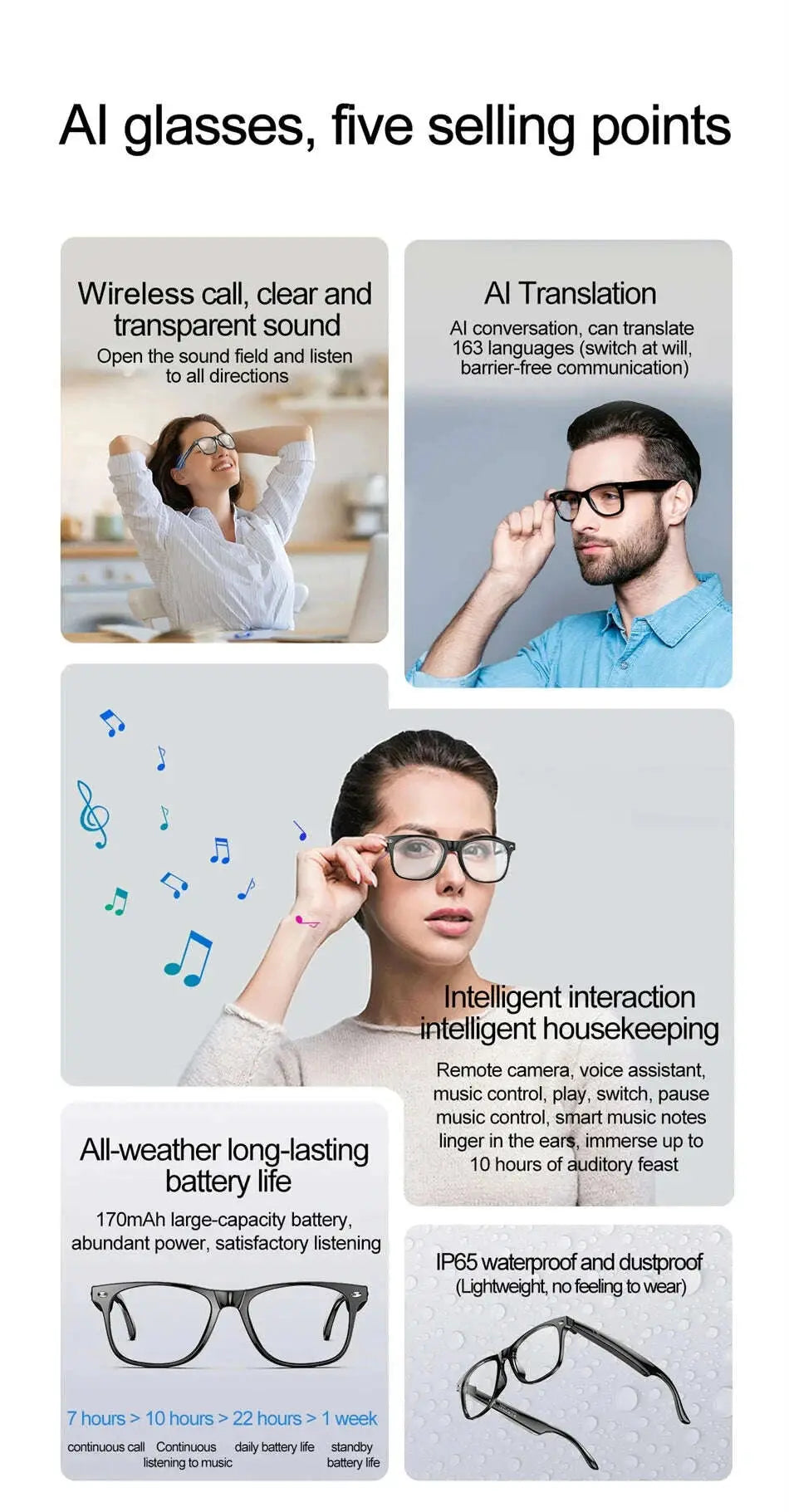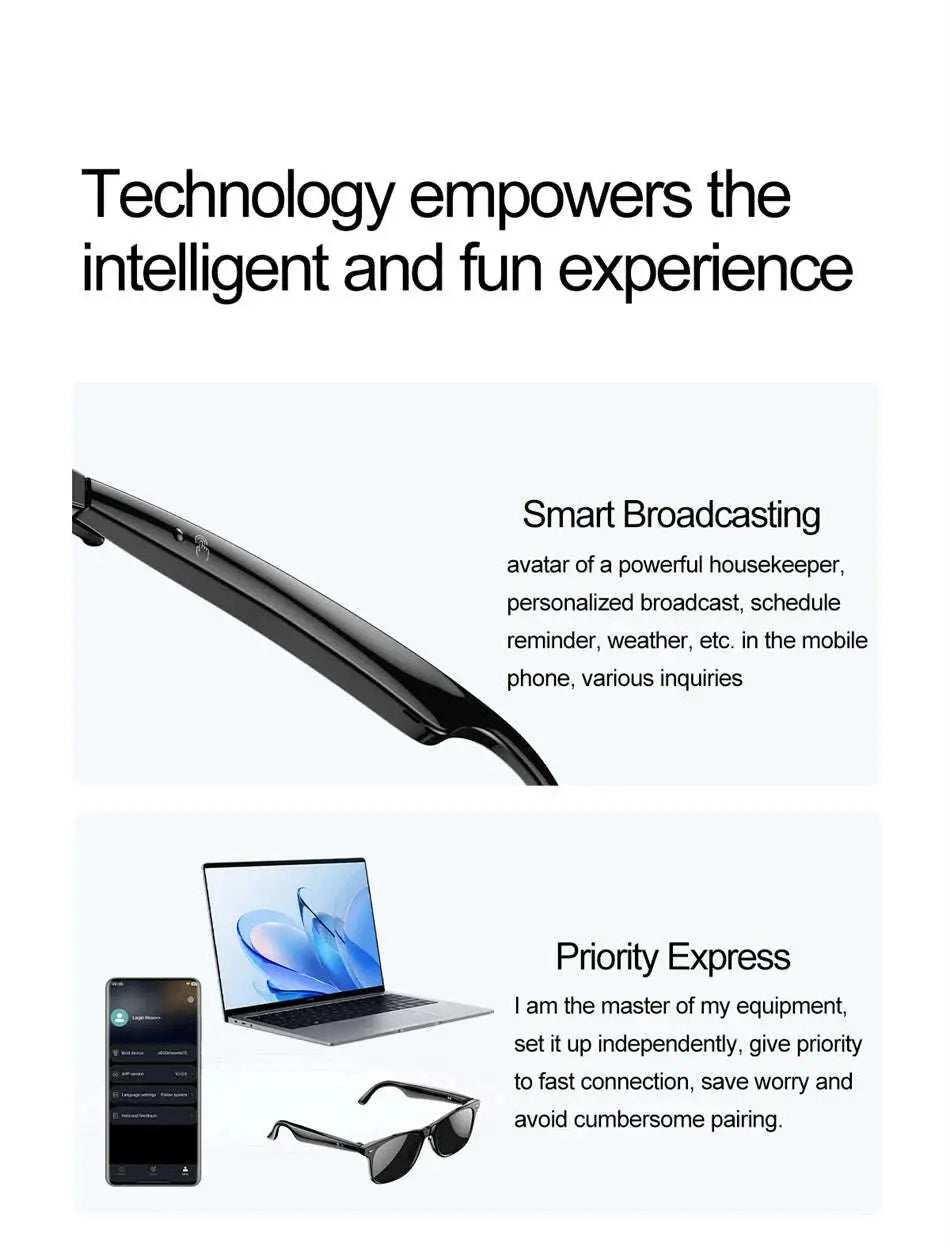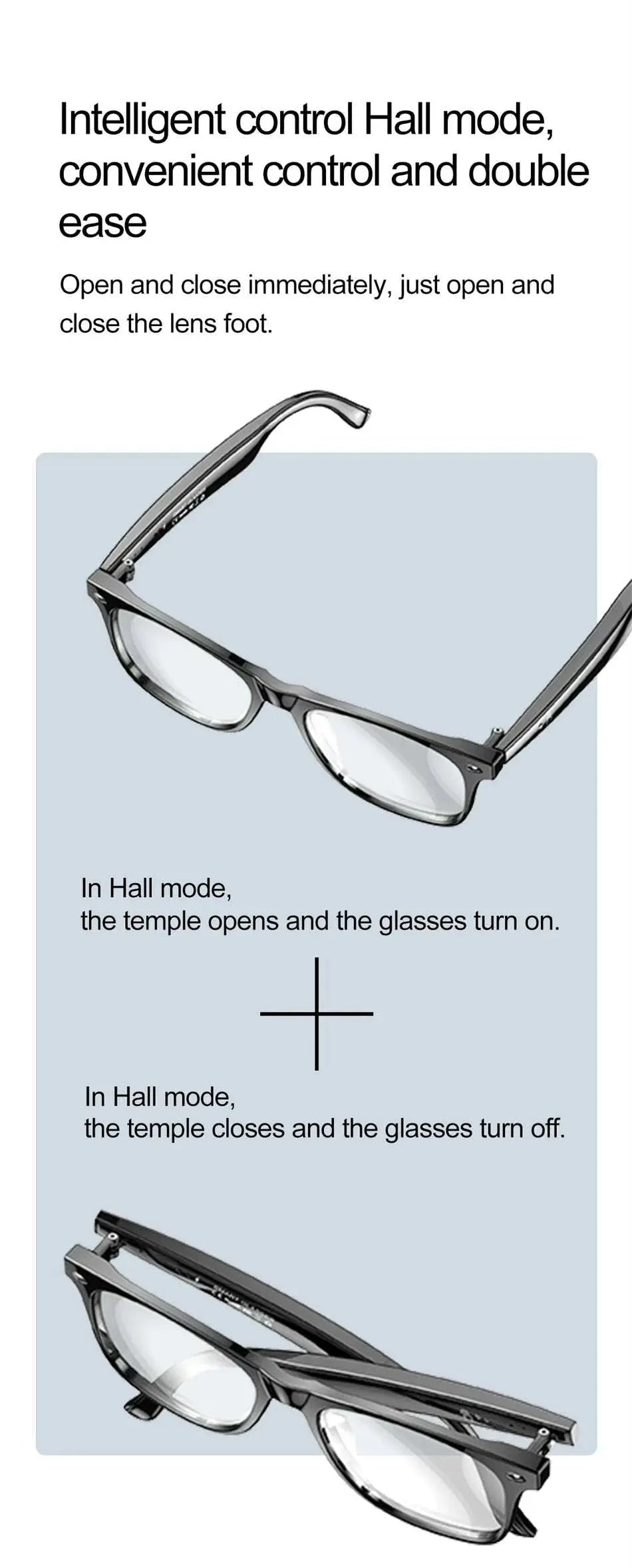 AI Bluetooth Audio Call Fashion Smart Glasses: Equipped with functions such as AI intelligent voice and video real-time translation, AI dialogue and Q&A, AI intelligent translation (including translator mode and the translation mode combining glasses and mobile phone, which can customize the translation of more than 163 languages), voice notes, sleep aid mode, photo translation, remote control photography, Bluetooth calling, automatic power on and off with intelligent Hall effect sensing, intelligent voice assistant, music playback (capable of operations like music switching and pausing for music appreciation), remote control photography, etc. It adopts the low-power AB5712F low-power chip, has the ENC noise reduction function, with ultra-low latency and long battery life. Weighing only 25 grams, it is so light that it gives almost no wearing sensation and is extremely comfortable to wear. It can be equipped with various types of lenses, such as sunglasses lenses, anti-blue light lense