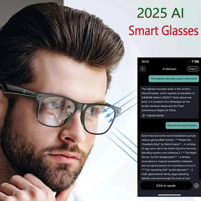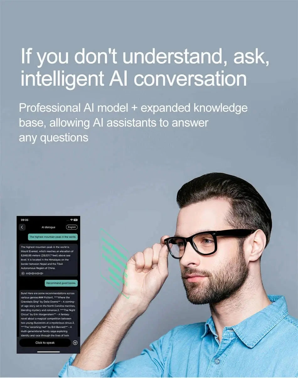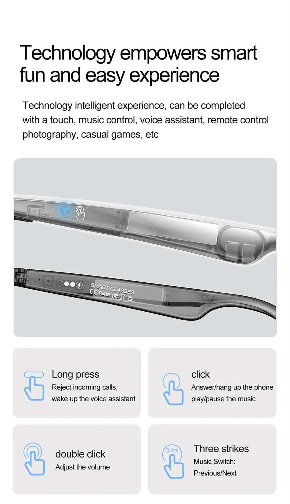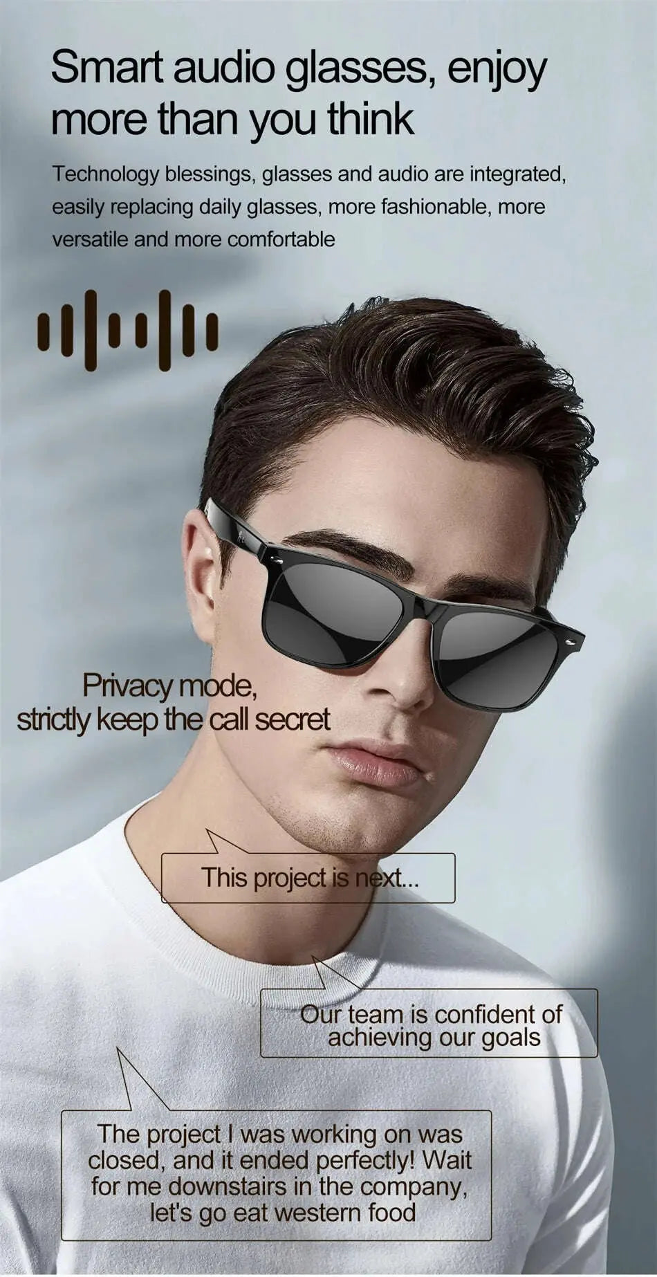 AI Bluetooth Audio Call Fashion Smart Glasses: Equipped with functions such as AI intelligent voice and video real-time translation, AI dialogue and Q&A, AI intelligent translation (including translator mode and the translation mode combining glasses and mobile phone, which can customize the translation of more than 163 languages), voice notes, sleep aid mode, photo translation, remote control photography, Bluetooth calling, automatic power on and off with intelligent Hall effect sensing, intelligent voice assistant, music playback (capable of operations like music switching and pausing for music appreciation), remote control photography, etc. It adopts the low-power AB5712F low-power chip, has the ENC noise reduction function, with ultra-low latency and long battery life. Weighing only 25 grams, it is so light that it gives almost no wearing sensation and is extremely comfortable to wear. It can be equipped with various types of lenses, such as sunglasses lenses, anti-blue light lense