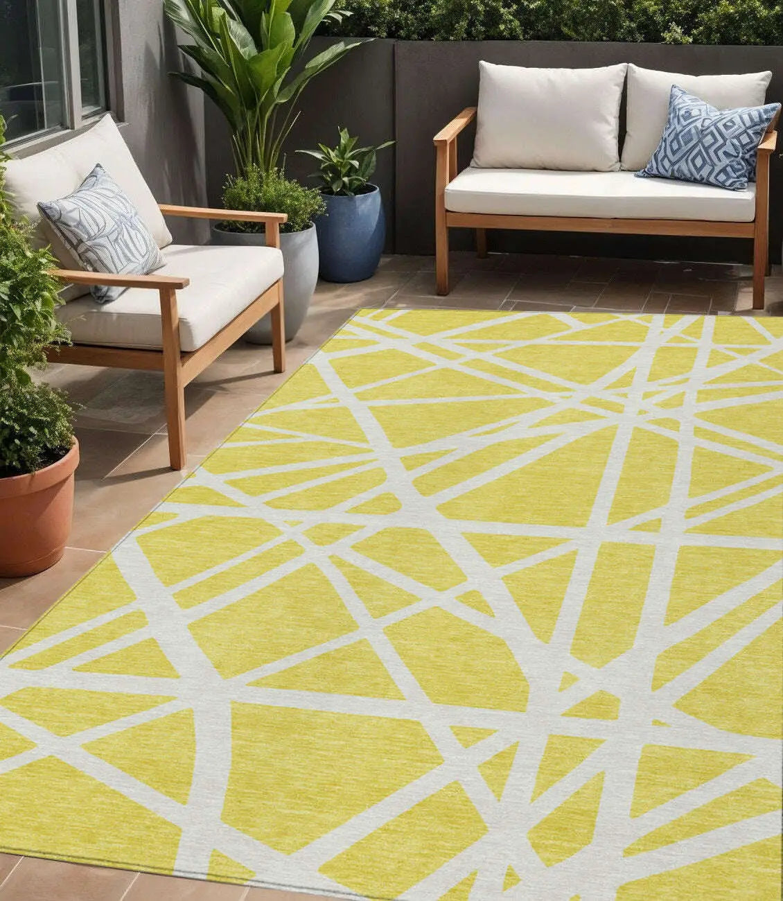 Add some artistry to your room with this 5-foot x 8-foot yellow and linen geometric washable indoor outdoor area rug. This rectangle shaped rug features a geometric design that will work well both indoors or out. A classic shape marries with good looking design for your living room, hall, bedroom, porch, patio, or poolside. Ideal for outdoor spaces or high traffic areas with kids and pets, this rug is made from heavy duty polyester that is stain resistant to help repel water, dirt, and stains. Makes a great way to dress up your patio, porch, or poolside, but also works well as a durable and easy to maintain option in the kitchen, family room, or mudroom. 60-inch h x 90-inch w x 0.19-inch d.