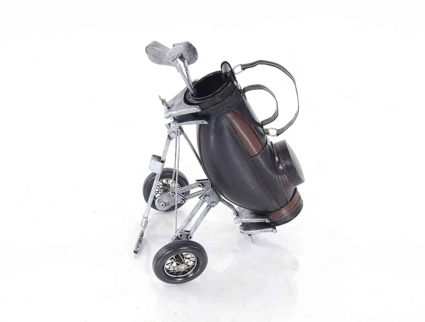 golf bags on pull carts help the golfer or golf caddy distribute the weight so that it can be rolled rather than carried. this golf bag is versatile?it can be used as decor or even used as a pen holder, with the pens sitting with the clubs. the metal wheels also roll as you pull the cart with the handle. also, the handle is on a hinge which allows the cart to be positioned in several ways if desired. this memorabilia is 100% iron frame; like all of our models, no plastic parts have been used. the model is handmade as well as painted for a more vintage look. ? 100% iron frame ? no plastic parts ? painted exterior ? handmade and hand painted ? wheels roll