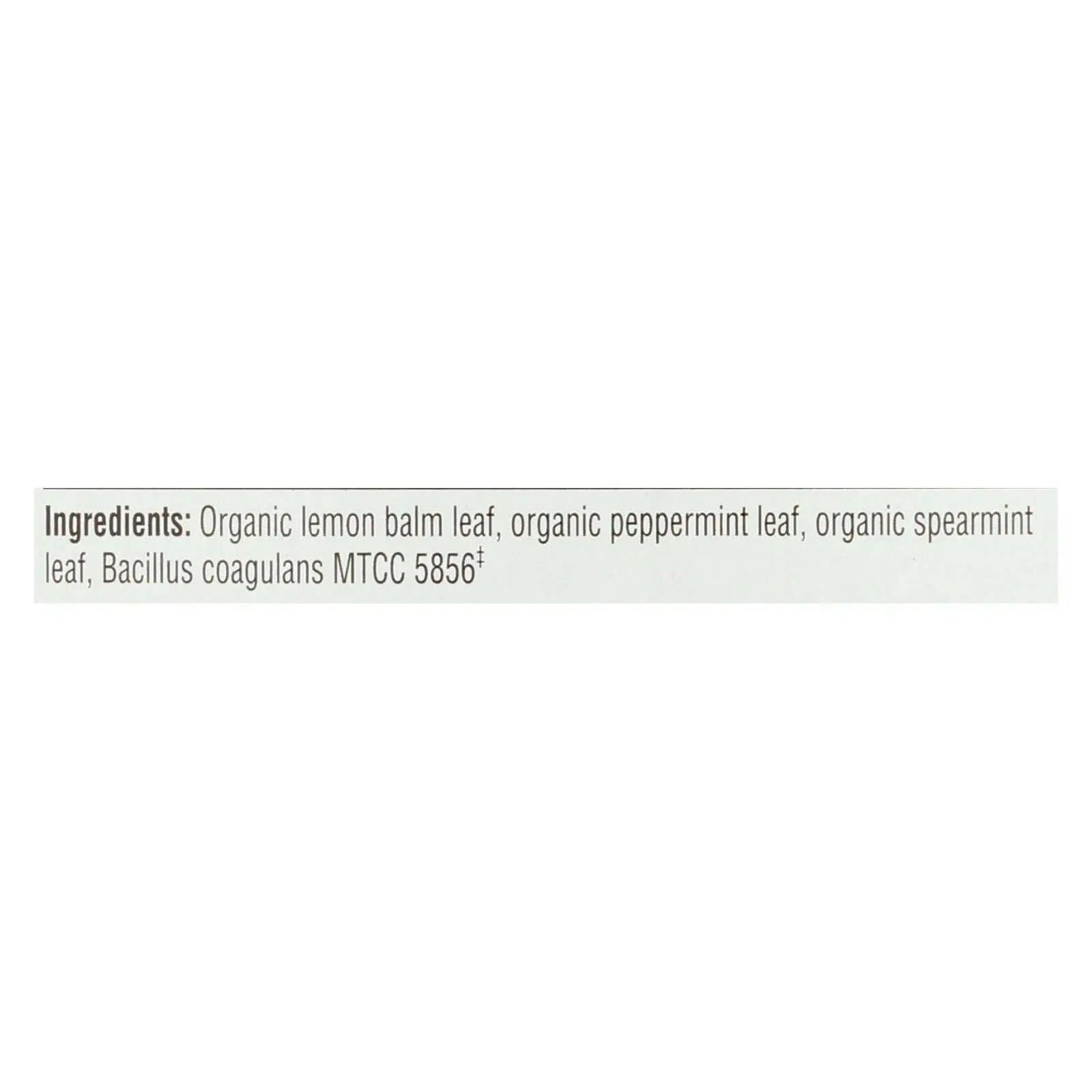 ingredients : organic lemon balm leaf;organic peppermint leaf;organic spearmint leaf;bacillus coagulans mtcc 5856‡