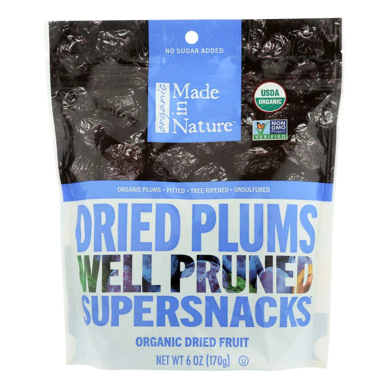 Made in nature plums organic dried fruit puts a spin on familiar, traditional plums. Our usda and iqa certified organic plums are tree-ripened and sun-dried to wrinkly perfection. These non-gmo project verified plums are made to be rich, sweet, soft and loaded with nutrition. Includes one 6 oz. Pouch of made in nature plums organic dried fruit.