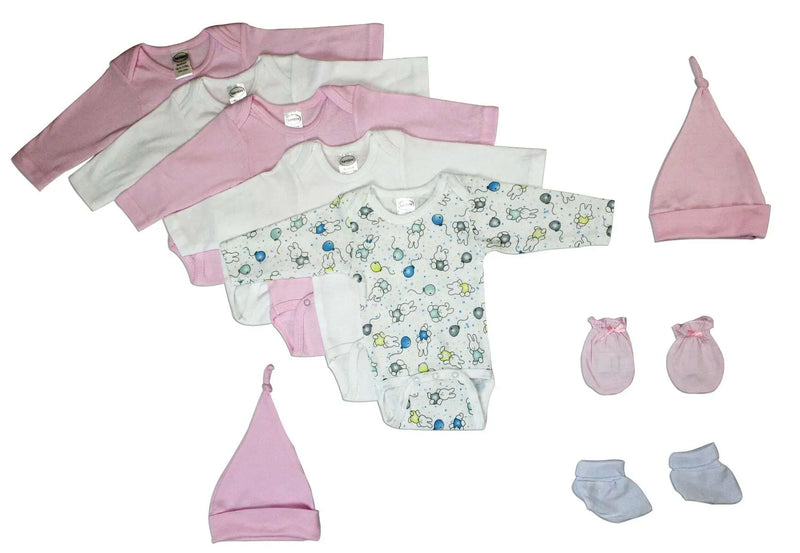Girls Long sleeve Printed Onezie Variety 3 Pack (100% Cotton), Pastel Yellow Long Sleeve Onezie (100% Cotton), White Long Sleeve Onezie (100% Cotton), Pink Knotted Baby Cap (100% Cotton), Pink Knotted Baby Cap (100% Cotton), Pink Infant Mittens (Jersey), White Booties (100% Cotton)