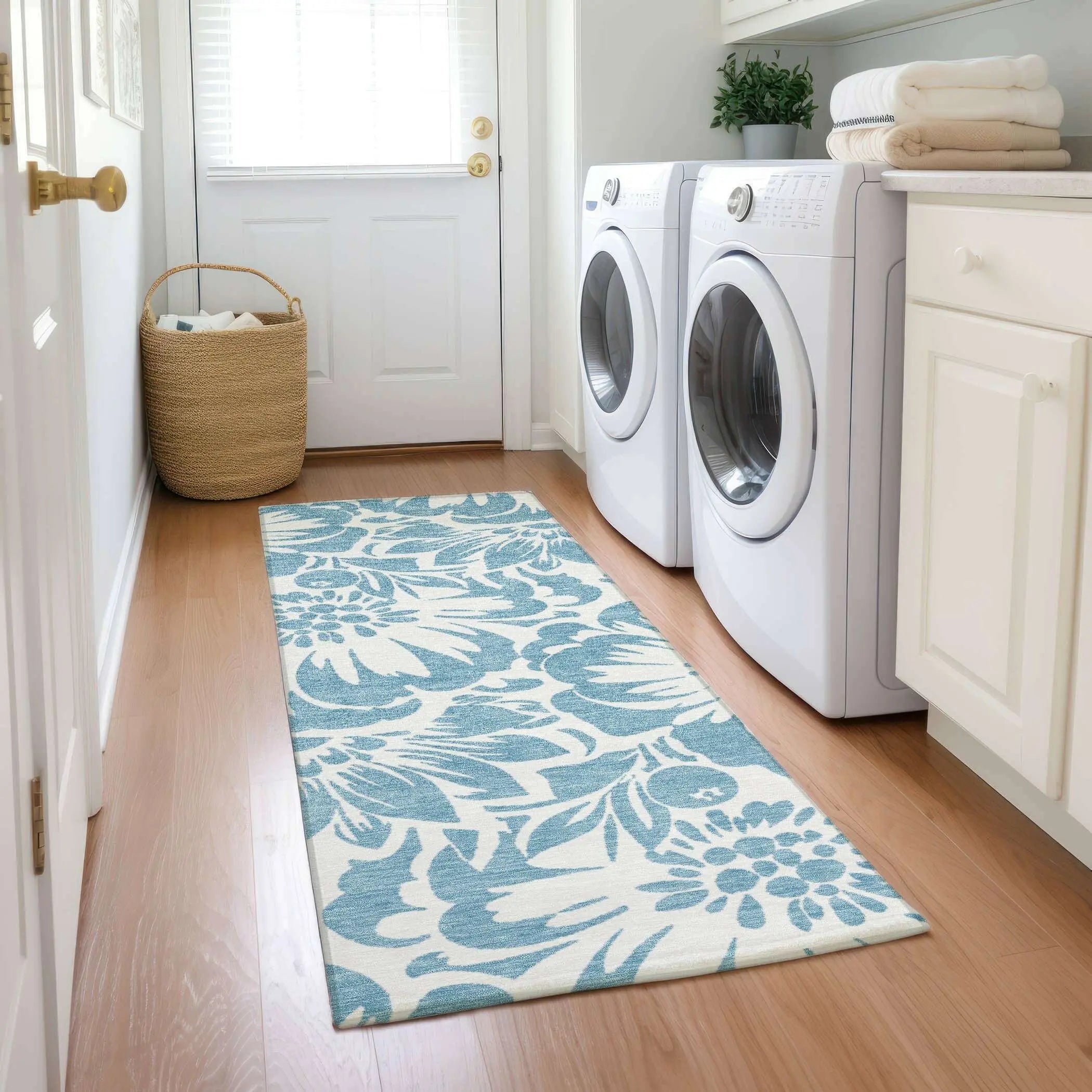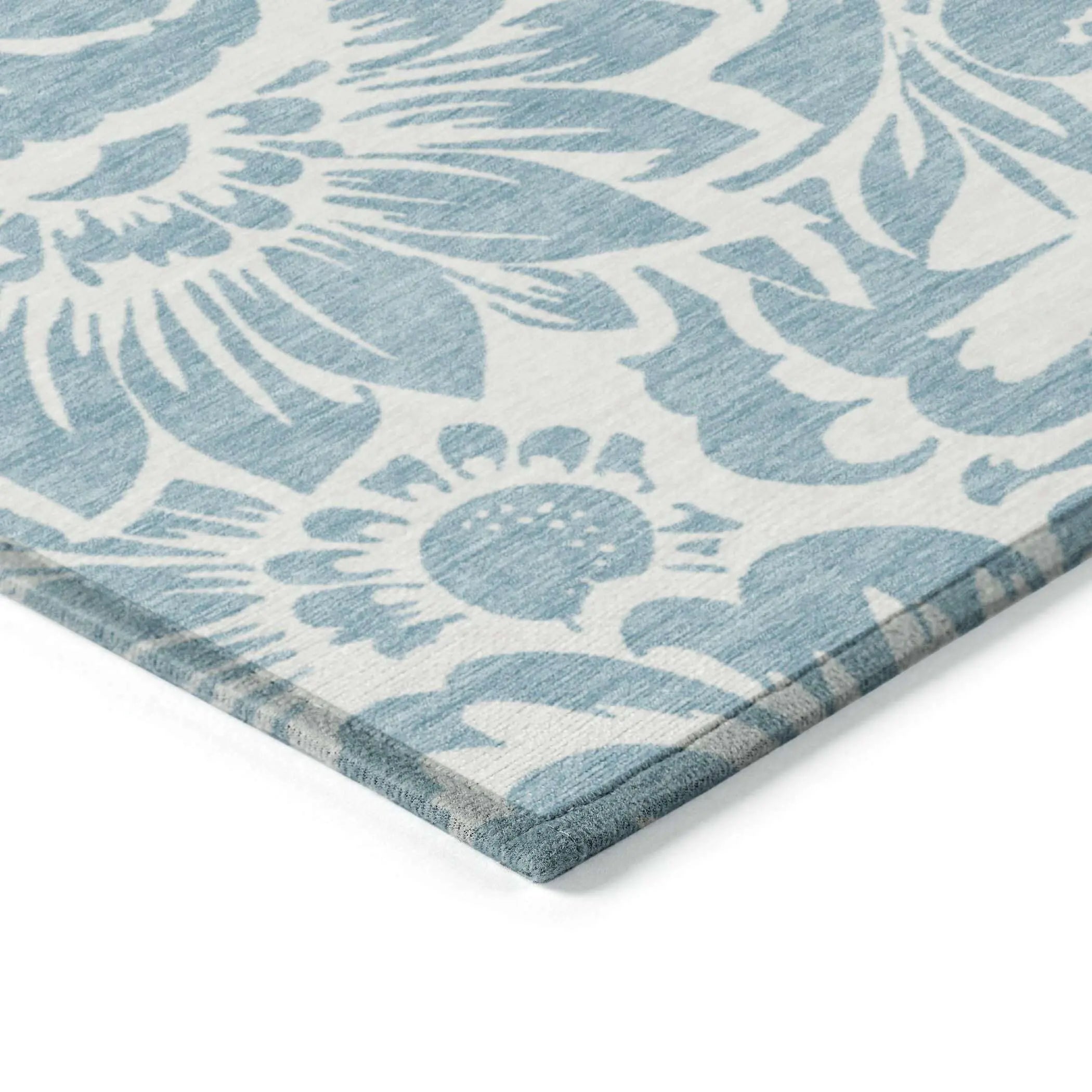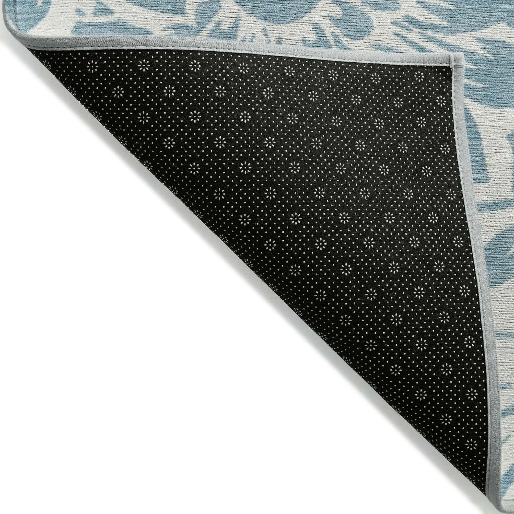 8' Runner Denim and Ivory Floral Washable Non Skid Indoor Outdoor Runner Rug