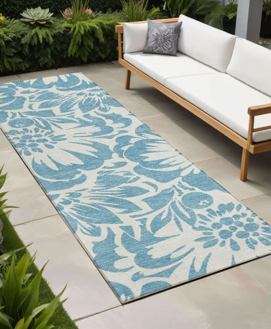This 8-foot runner denim and ivory floral washable stain resistant non skid indoor outdoor runner rug, is a great way to add warmth to a room. This runner shaped rug features a floral design in denim and ivory to give it visual interest. A classic shape marries with good looking design for your space ideal for spaces with kids and pets, this rug is stain resistant to help repel stains and spilled liquids. Place this area rug against a hardwood or tile floor and it will enliven your living space with style and sophistication. 27-inch H x 90-inch W x 0.19-inch D